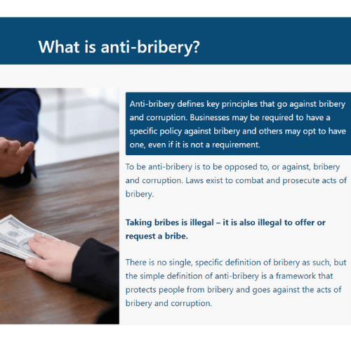- 单元1 -介绍贿赂——反贿赂的第一单元课程,您将学习贿赂到底是什么以及它可能意味着为你和你的业务。您还将了解反贿赂的历史。